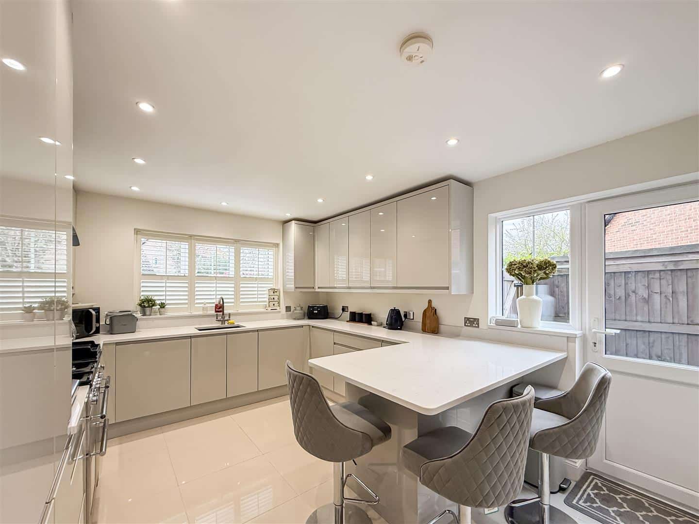 The kitchen is fitted with a range of modern light grey high gloss eye level units, matching base units and drawers with quality quartz work tops and splash backs over. One and a half inset sink and Quartz grooved drainer, integrated, fridge/freezer, washing machine and dish washer and a quality Rangemaster oven to remain. Matching breakfast bar incorporating a wine cooler, tiled flooring, down lighting, double glazed window to the front with fitted white/shutter blinds and a double glazed door and window to the side.