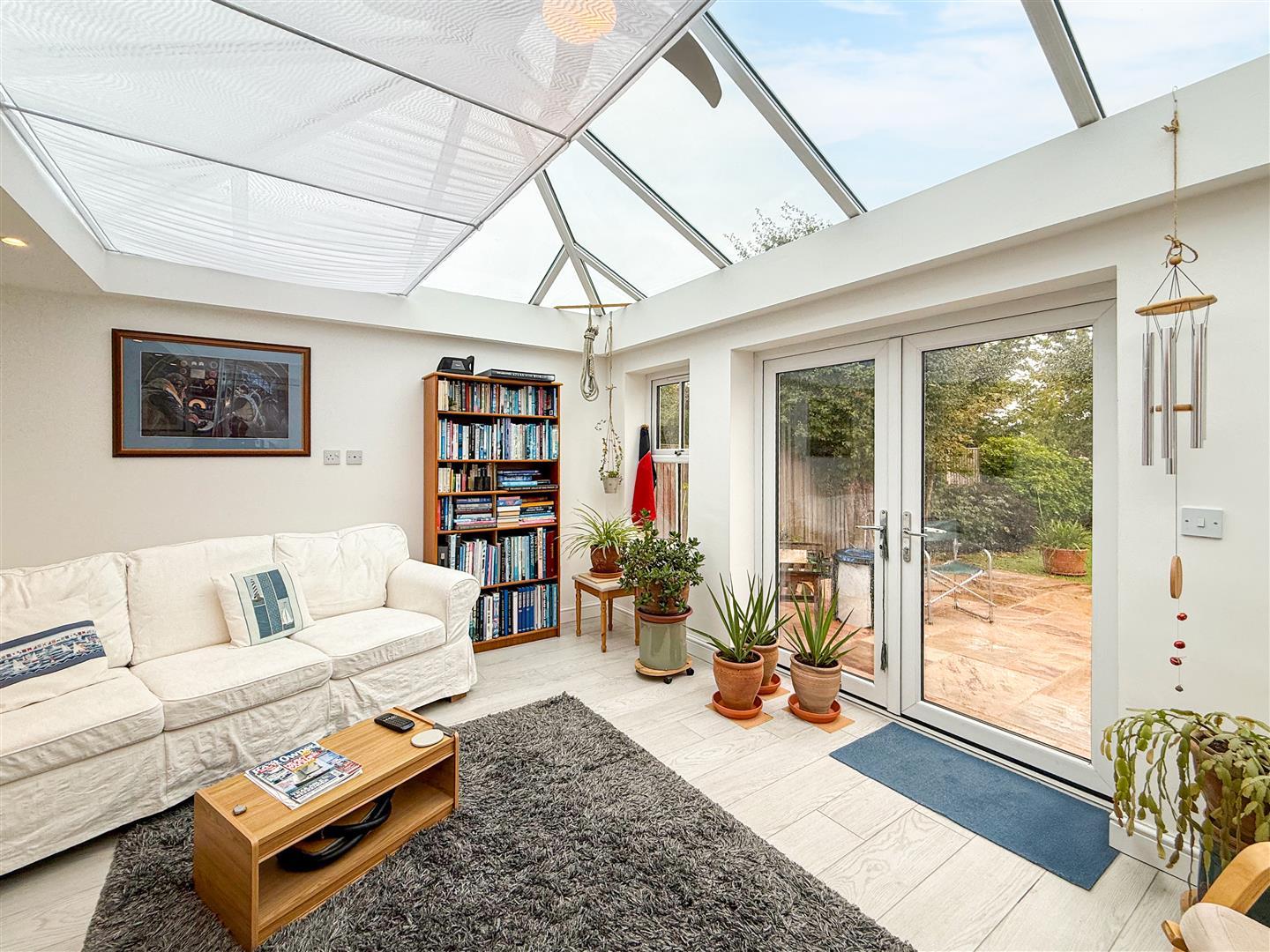 Having a second sitting room/lounge is certainly a great addition and this is a cosy room with a white fireplace surround and inset cast iron log burner, the antique effect Karndean flooring continues into this room and there is an wall inset for television with shelving and draw space.