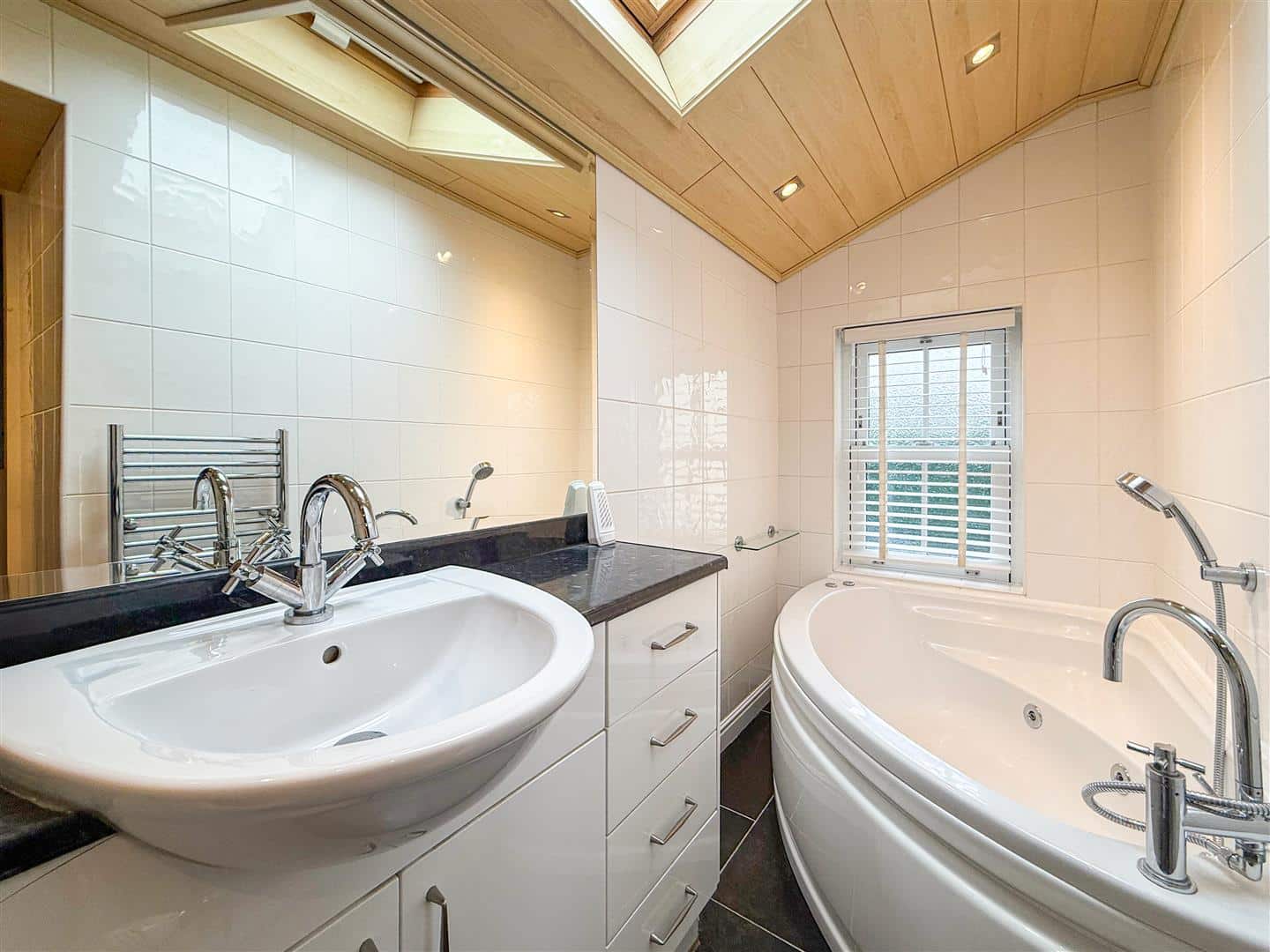 Tastefully fitted and having tiled walls and flooring, vanity unit surround with built in cistern and w/c, hand wash basin with cupboards and draws below, Jacuzzi style panelled corner bath with taps/shower attachment. Double glazed window to the front, large velux style ceiling window, expel air and chrome heated towel rail.