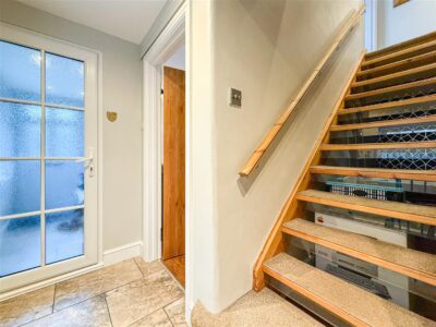 Smooth plastered ceiling with down lighting, ceramic tiled flooring, double glazed sash window to the side, radiator and stairs to the first floor.