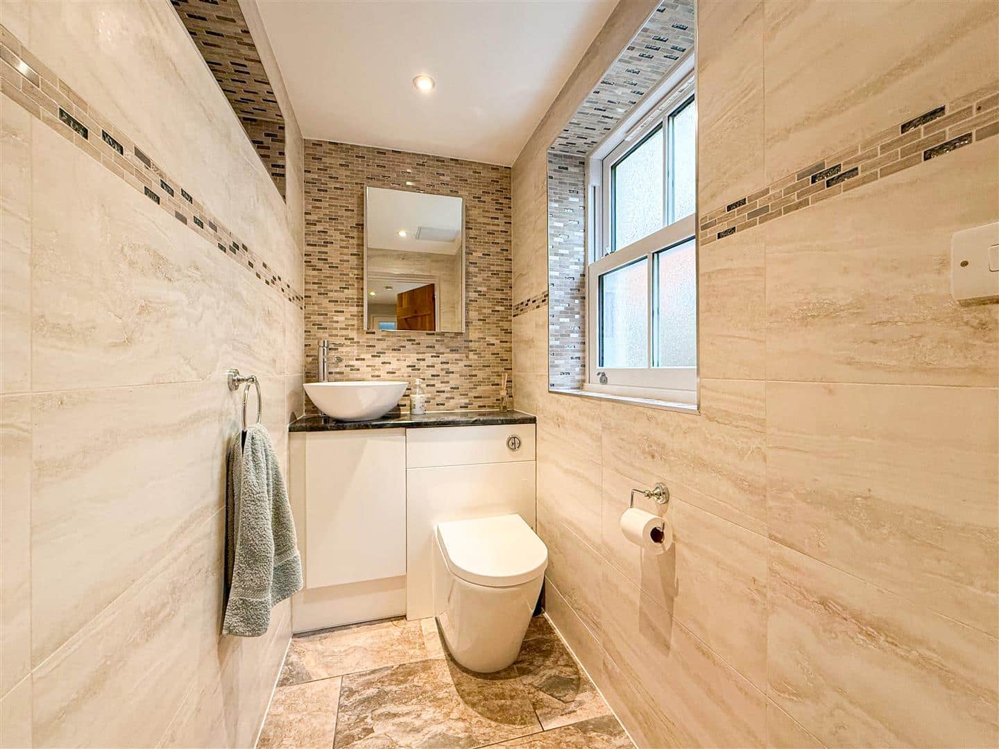 Tastefully fitted with a vanity surround and storage corner free standing sink, built in cistern and w/c, ceramic tiled walls and flooring, double glazed sash window to the side and light window to the sitting room.