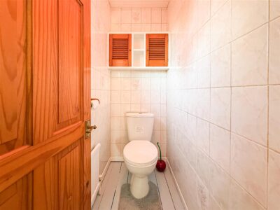 Part tiled walls, close coupled w/c, hand wash basin, expel air, radiator and a double glazed window to the side.
