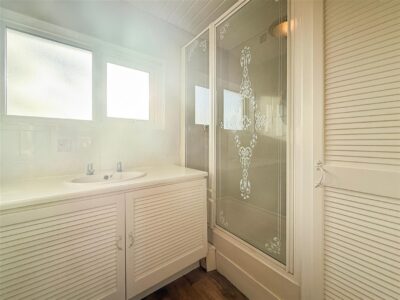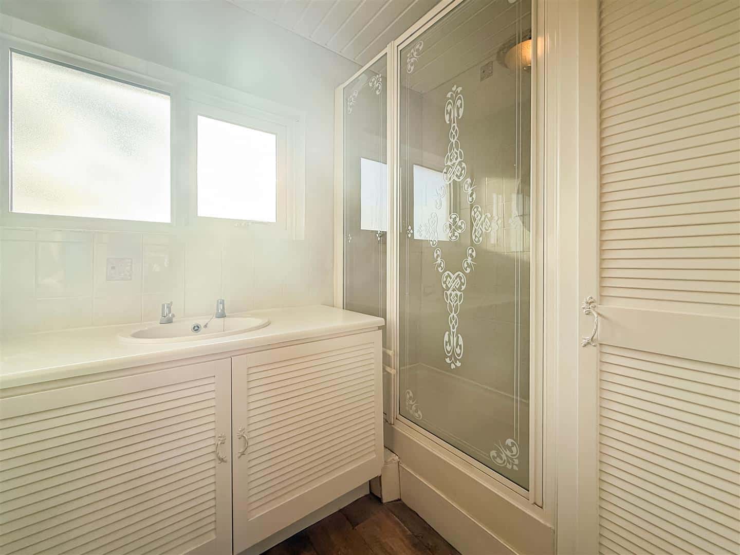Walk in double shower cubicle with built in cupboard to the side, inset hand wash basin with double cupboards below. Part tiled walls, radiator and a double glazed window to the rear.