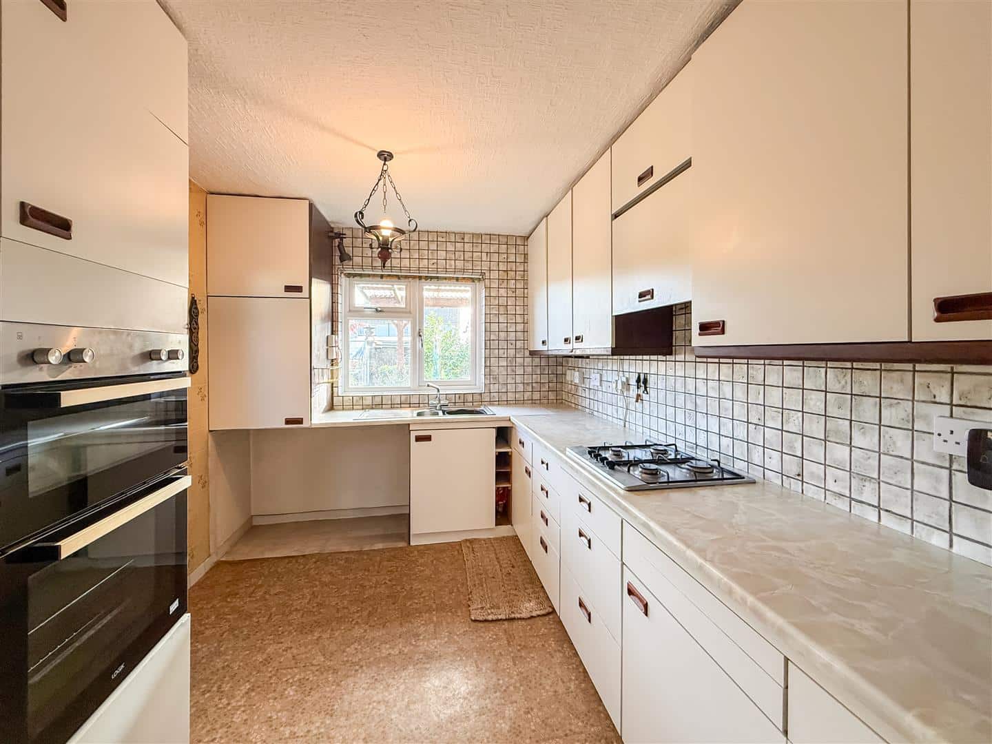 A range of white eye, base and matching drawers with work surfaces over. Inset stainless steel one and a half sink, inset stainless steel hob with above extractor and a built in stainless steel oven. Space for fridge/freezer, plumbing for washing machine and dish washer, radiator and a double glazed door to the side and double glazed window to the rear.