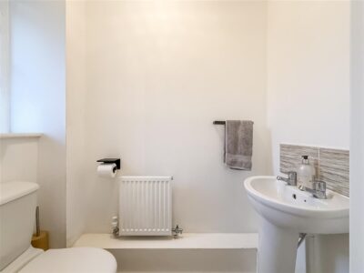 Close coupled w/c, pedestal hand wash basin, radiator and a double glazed window to the front.