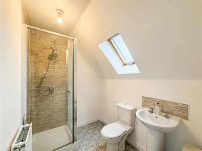 En-suite Walk in shower cubicle, close coupled w/c, pedestal hand wash basin, expel air, radiator and a double glazed window to the front.
