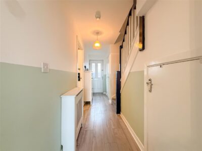 Double glazed entrance door to the hallway which has wood effect laminate flooring, radiator with decorative cover, stairs to the first floor with under cupboard.