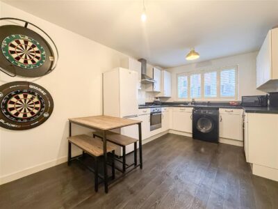 This is a nice size room with the kitchen having a range of white eye level units, matching base units and drawers with marble effect work surfaces over. Inset stainless gas hob with above stainless steel extractor and stainless steel oven below, plumbing for washing machine and dish washer and space for a fridge/freezer. Concealed wall mounted boiler ( not tested ) double glazed window to the front with fitted white/shutter blind. The dining area is a good space with plenty of space for a table and chairs and a radiator.