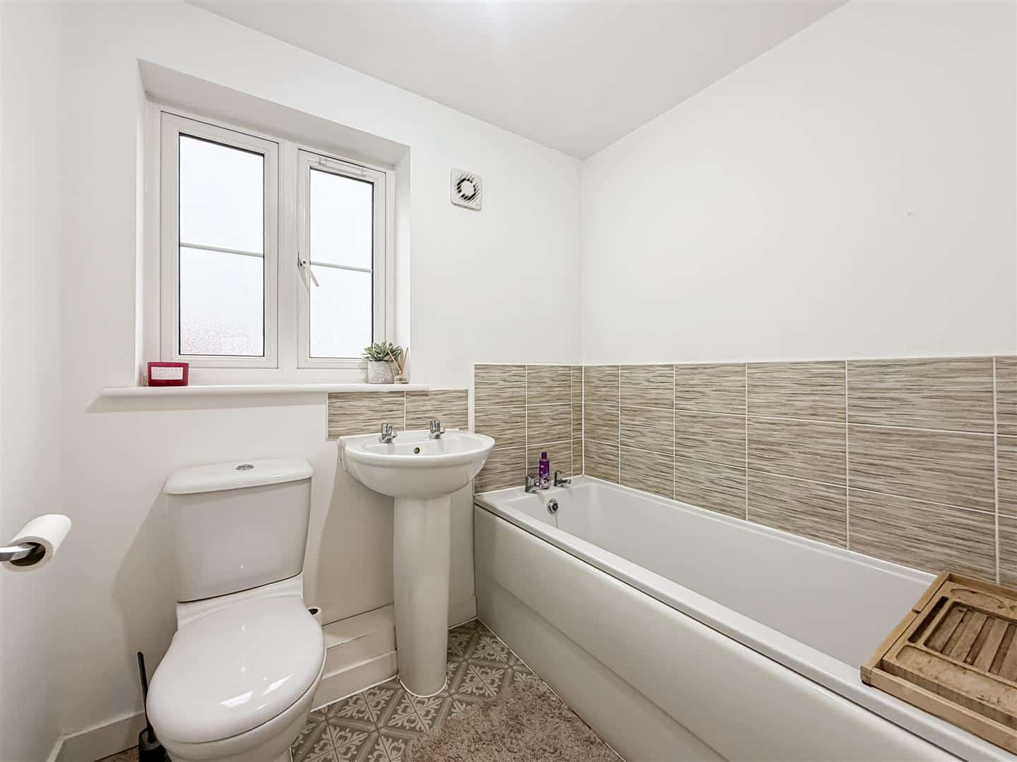 Part tiled walls, panelled bath, pedestal hand wash basin, close coupled w/c. Double glazed window to the front, expel air and radiator