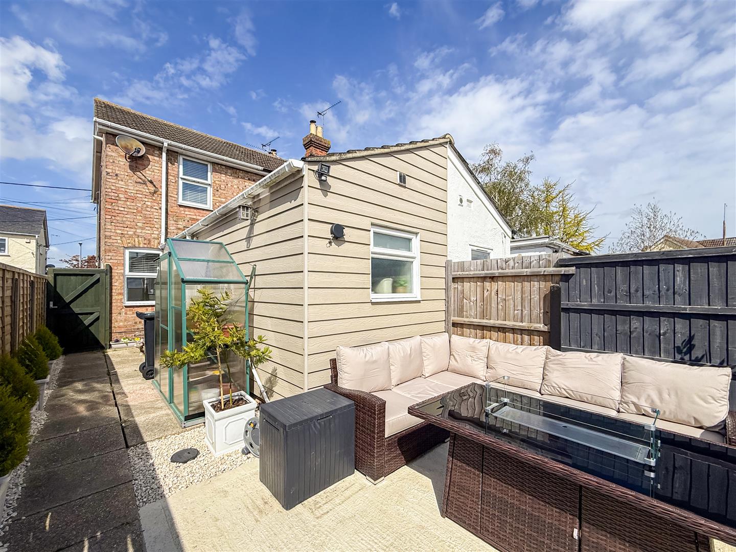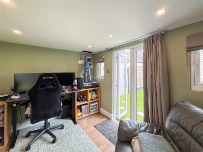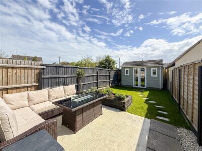 The remaining garden is neatly laid to lawn with majority newly replaced close board fenced boundaries, raised well stocked and planted border. Outbuilding with pitched tiled roof, making for an ideal home office, play room, man cave or similar which has power, light, insulation and electric heating.