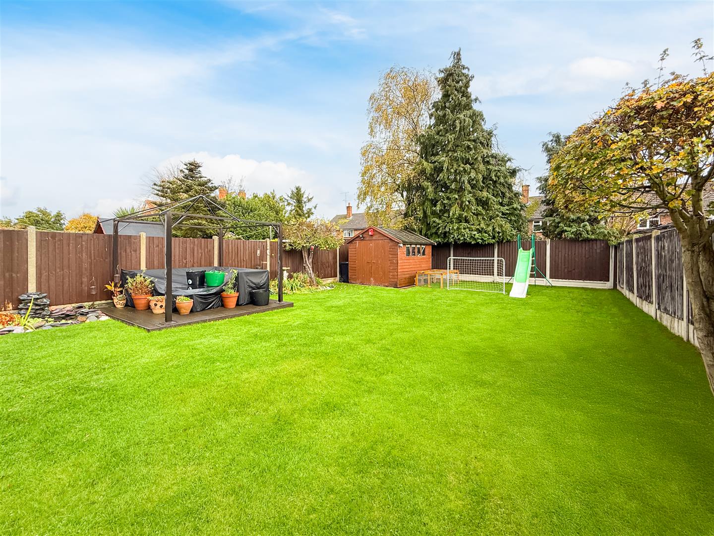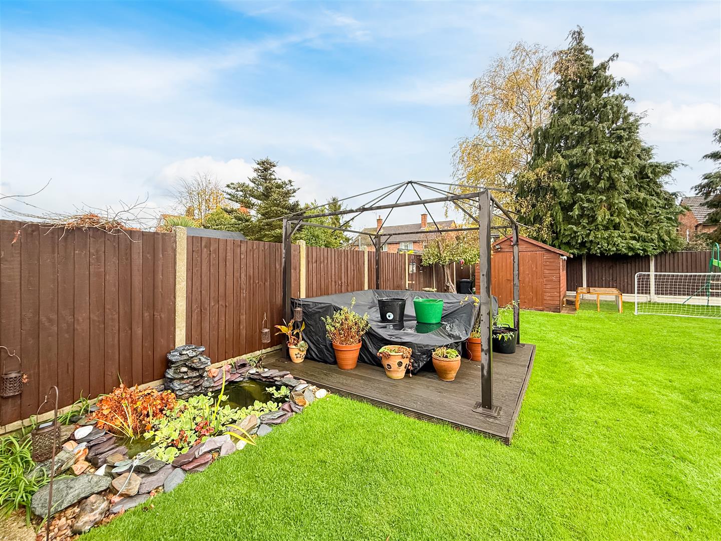 A neatly laid lawn with small ornamental pond. excellent size garden commencing with a patio area and outside water tap, Aluminium pergola with laid sun deck/bbq entertaining area, garden shed, power points and close board fenced boundaries.