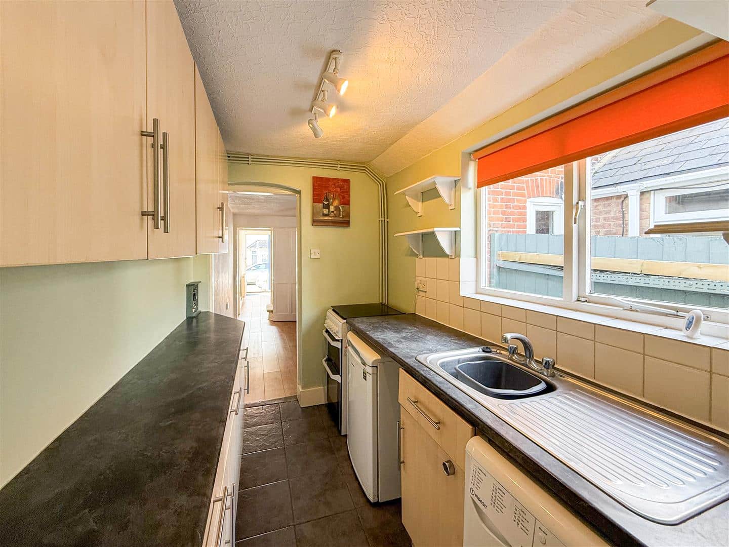 The kitchen has a range of beech effect eye level units, matching base units and drawers with roll top work surfaces over. Inset stainless steel sink, space for gas/electric oven, space for fridge/freezer, plumbing for washing machine and window to the rear.