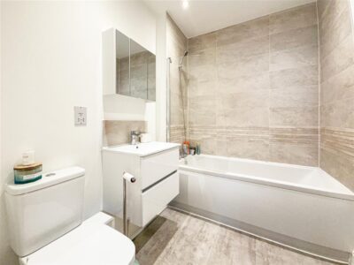Panelled bath with taps/shower attachment and screen, hand wash basin with vanity drawers below, close coupled w/c. Chrome heated towel rail, shaver point, down lighting and expel air.