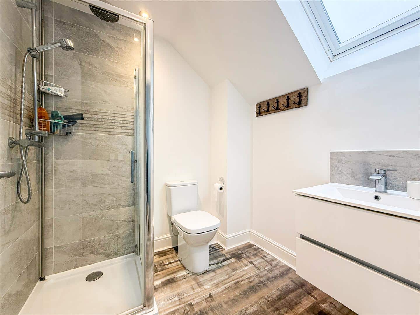 En-suite Walk in shower cubicle with hand held and rain showers, hand wash basin, close coupled w/c. Chrome heated towel rail, down lighting and double glazed ceiling window.