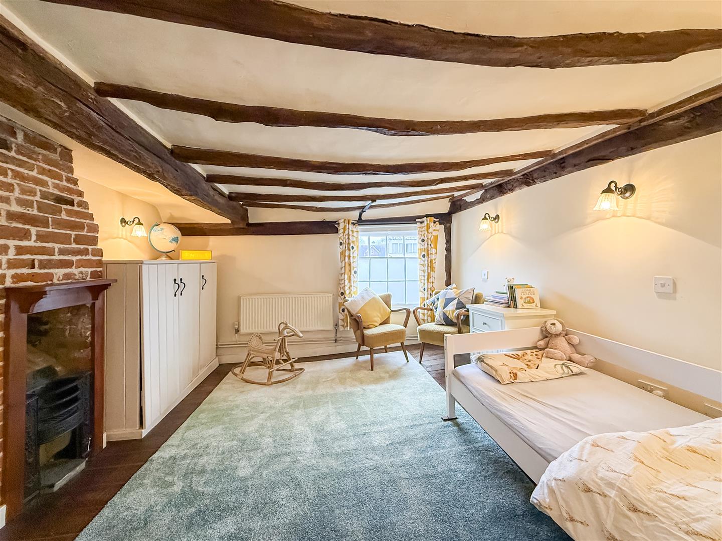 Brick exposed original cast iron fireplace, original exposed wooden floorboards, two built in cupboard/wardrobes. Exposed original beams, sash window to the front and radaitor.