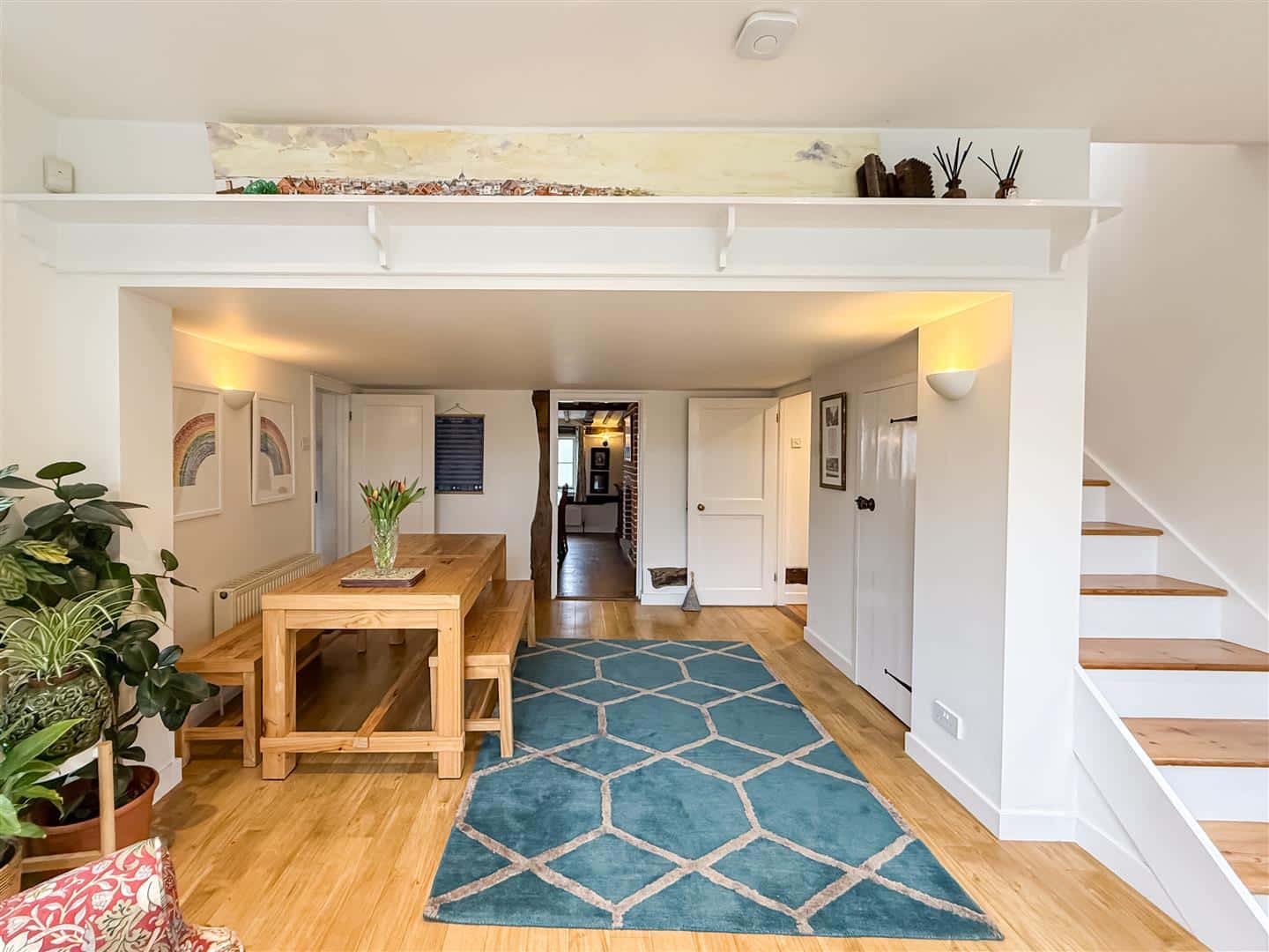 Stairs to the first floor with understairs cupboard, windows to side aspects, down lighting, solid oak flooring and two radiators.