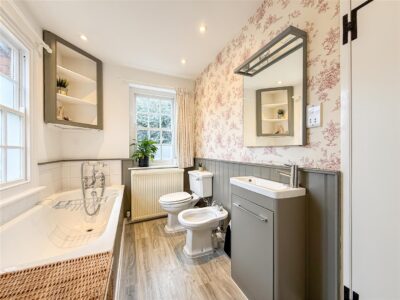 En-suite Part tiled walls, panelled bath with chrome/taps/shower, hand wash basin with vanity unit below, close coupled w/c and bidet. Down lighting, radiator and a sash window to the rear.
