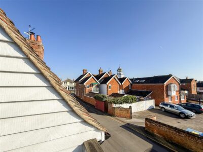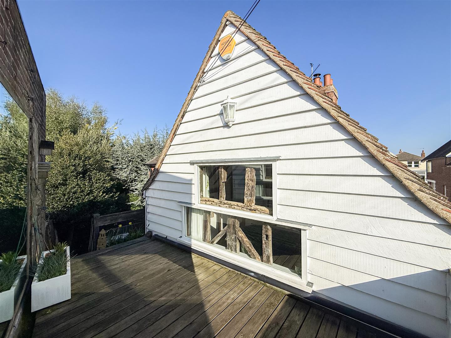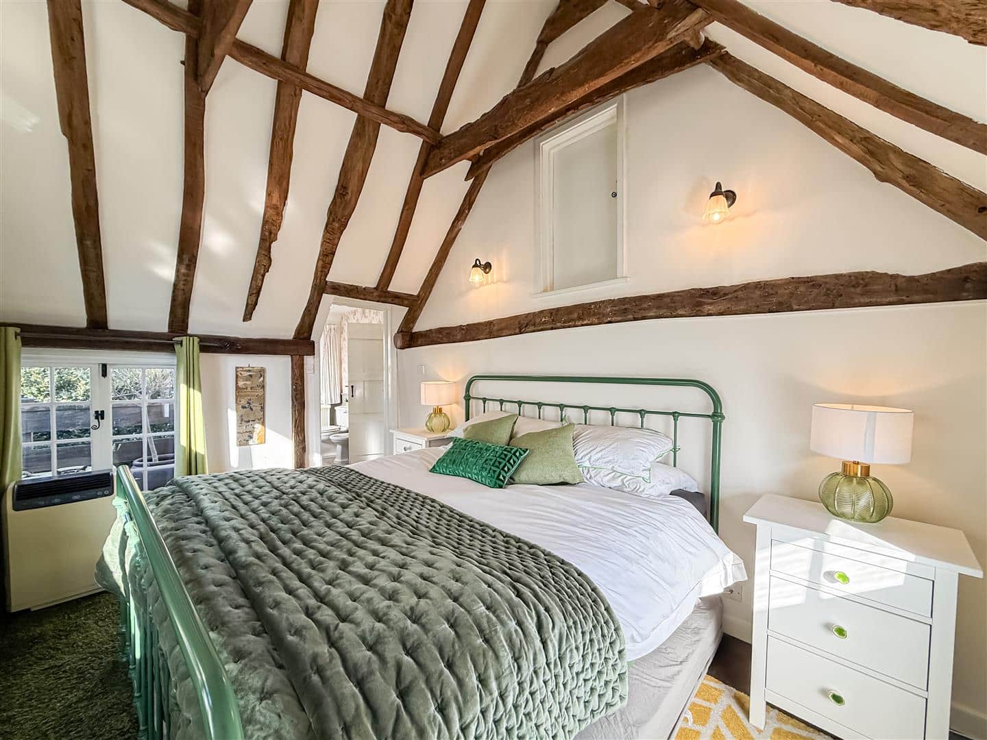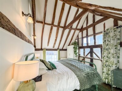 A beautiful principal bedroom with a high beamed vaulted ceiling, window with surrounding exposed beams and views over to Burnhams clocktower. Over size double opening windows to the side which can access to the split level wrap around veranda, sash window to the front, above storage space and radiator.