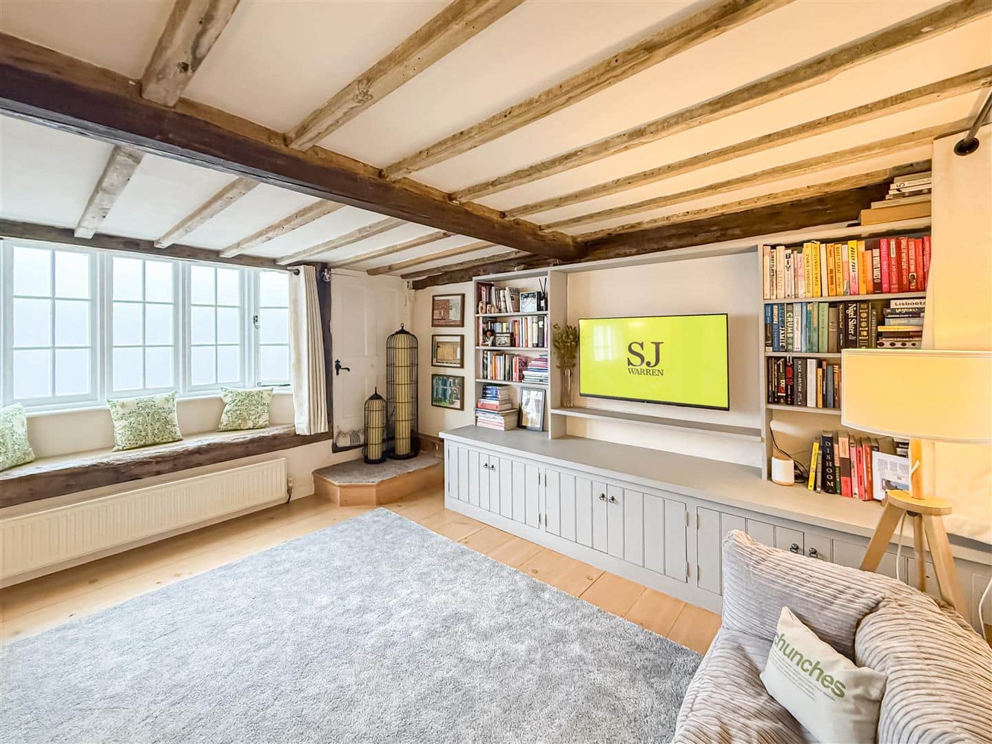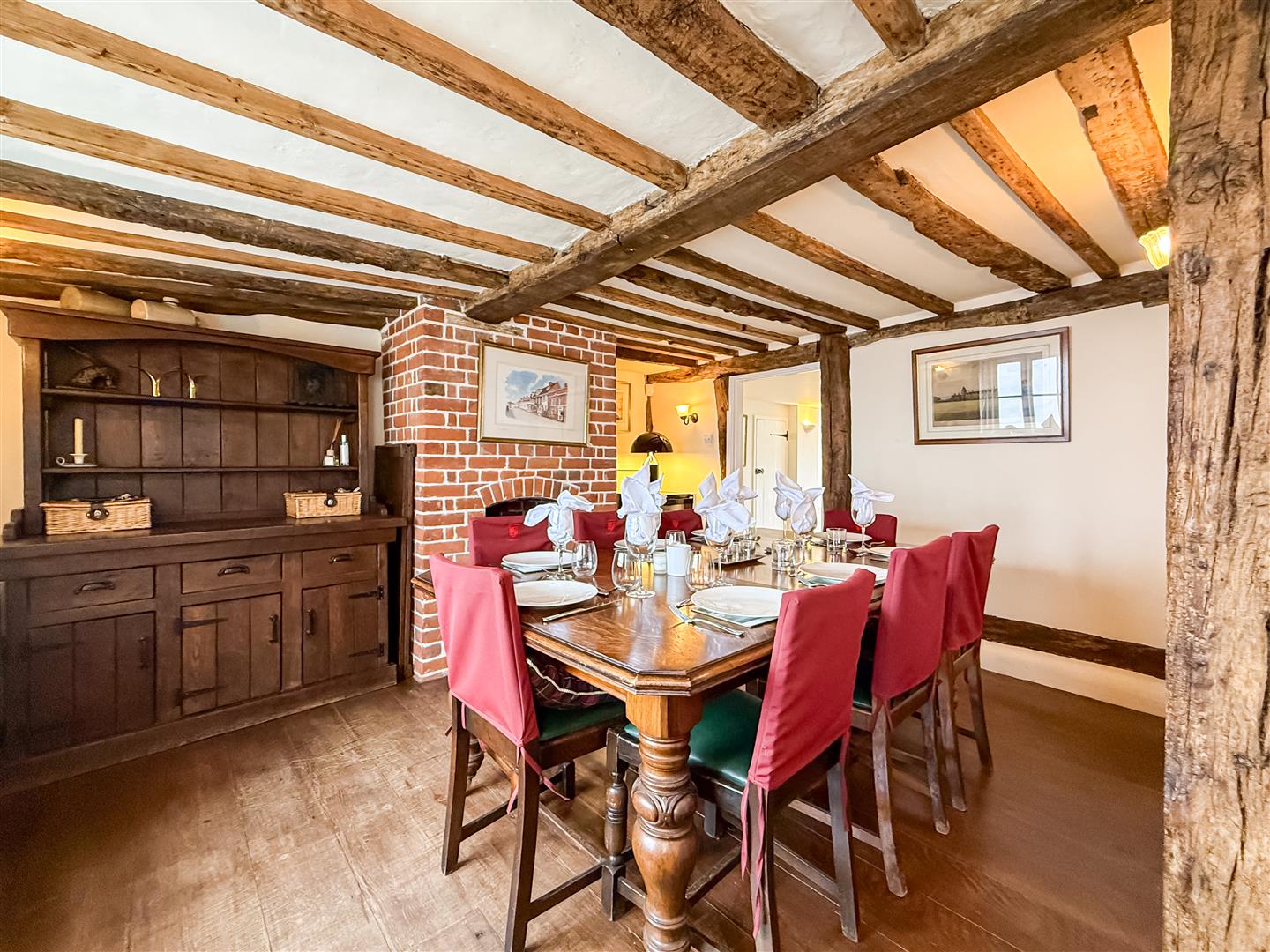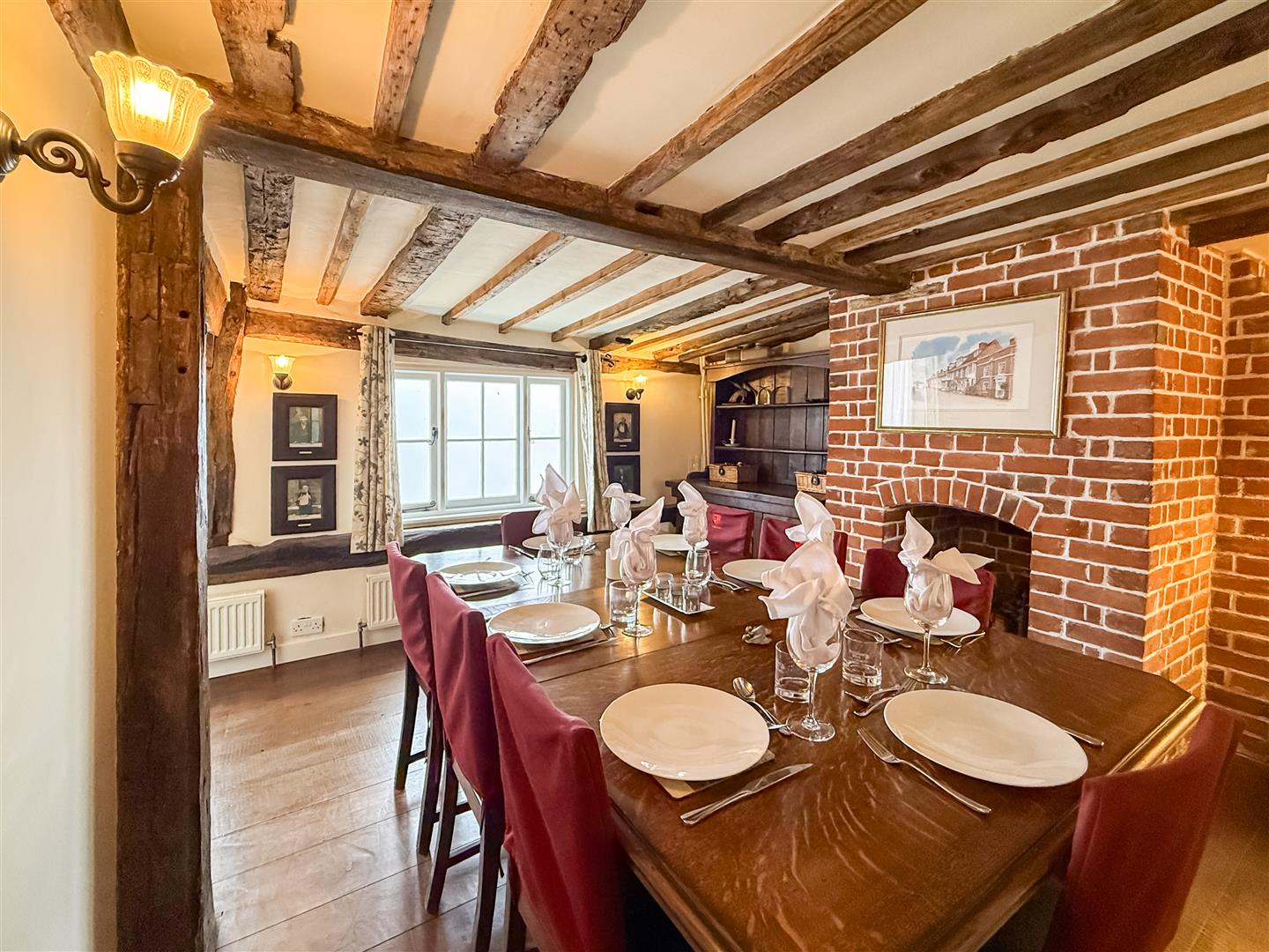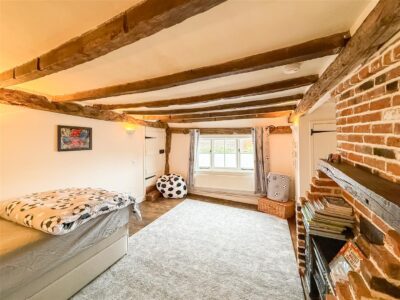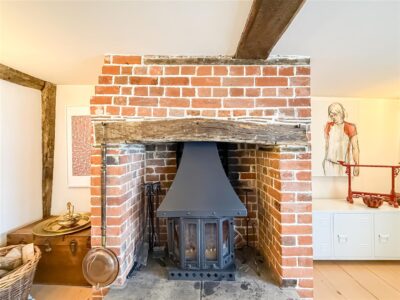 This is a amazing room with exposed wall, floor and ceiling beams, many of which show the original hand hewn features. The original rectangular shop bay window to the front with a window seat, further window and door to the front. Large open brick exposed fireplace with wood burner to enjoy on those cold winter nights, exposed wooden floorboards and fitted cupboards with shelving and space for a television.