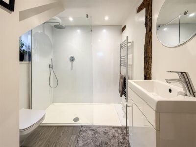 Double walk in shower with rain and hand held showers, w/c with built in cistern and twin button flush, hand wash basin with vanity cupboard below. Chrome heated towel rail, down lighting and a window to the side.