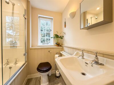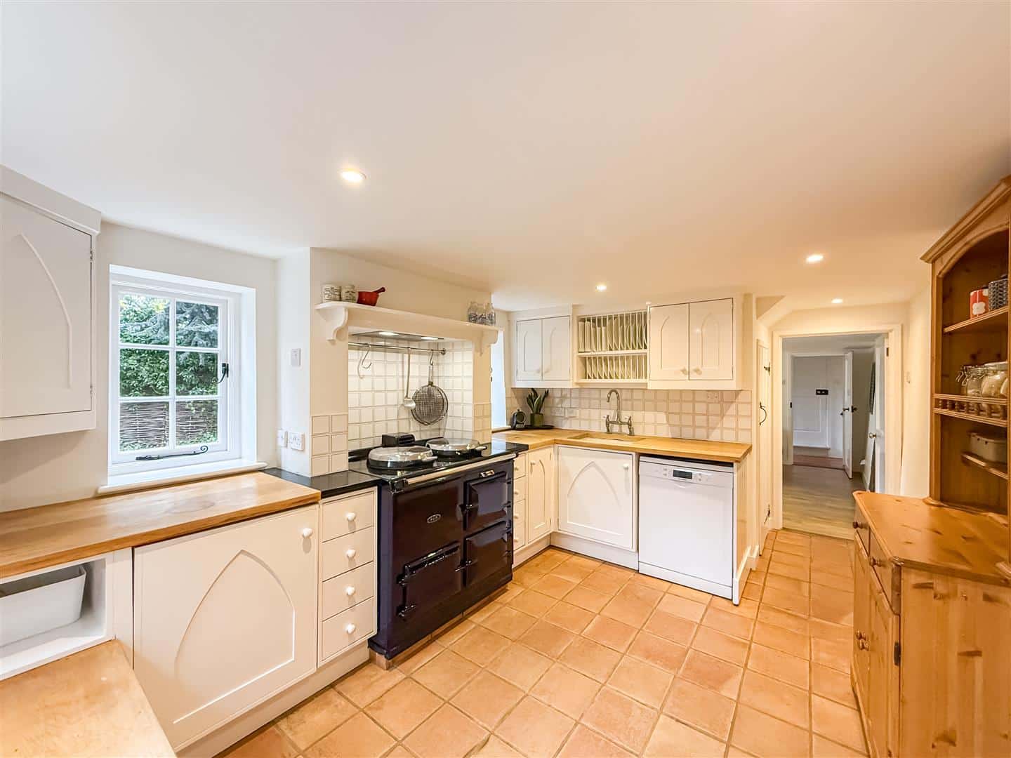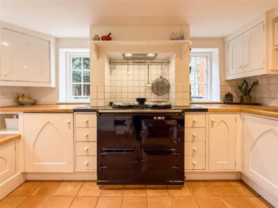 The kitchen has that very cottage style and feeling and just blends in as with all the rooms. There are a range of white eye level units with back tiling, matching base units and drawers with solid wooden work surfaces over. Inset butler sink and an Aga gas range oven with above extractor, space for fridge/freezer, plumbing for a dish washer, larder/cupboard with reclaimed marble shelves from when the property was a fishmongers, tiled flooring and down lighting. Dual windows to the rear, door and a sash window to the side.