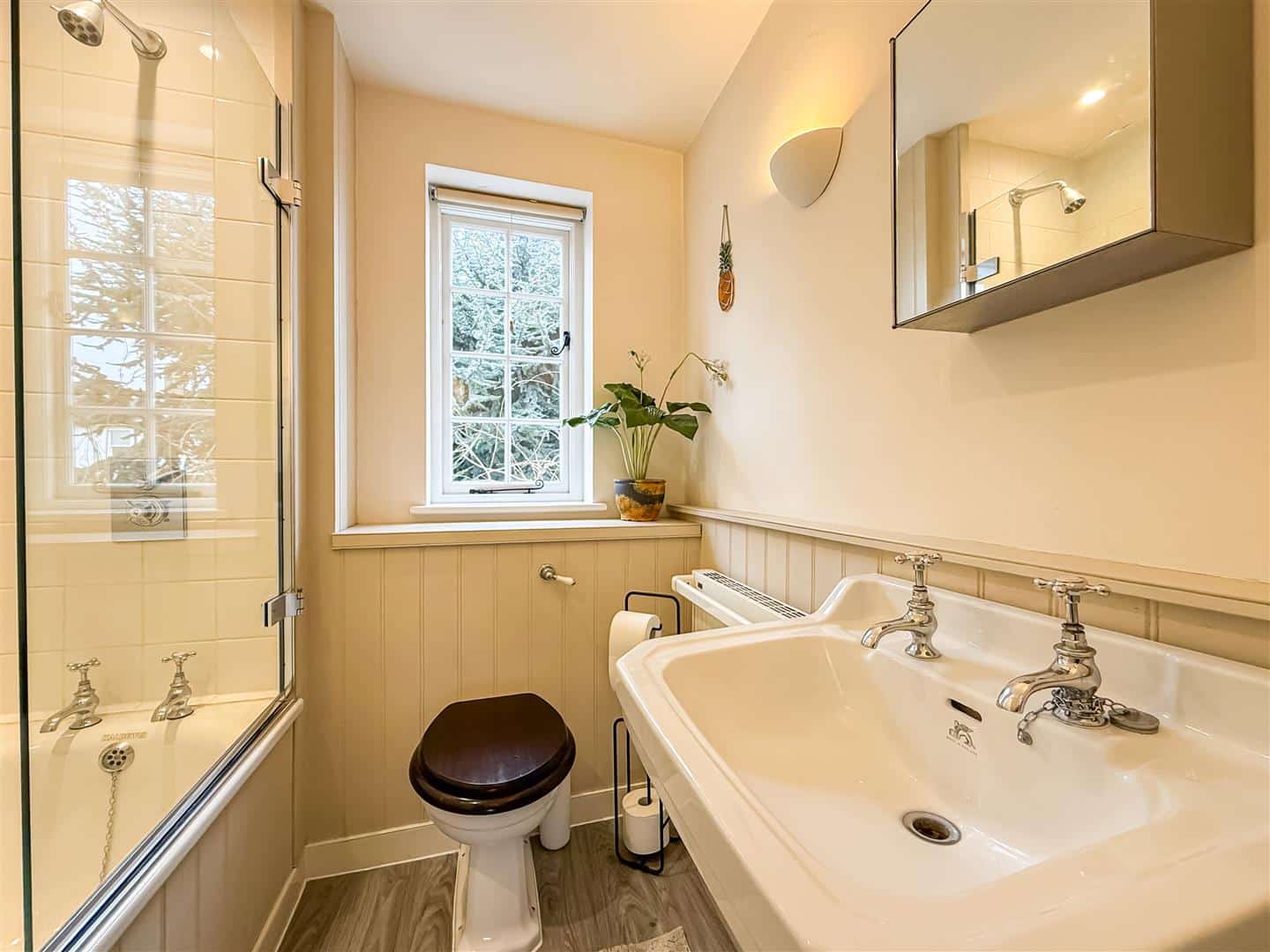 Panelled bath with above fitted shower and screen, pedestal hand wash basin, w/c with built in cistern, part tiled walls, radiator and window to the rear.