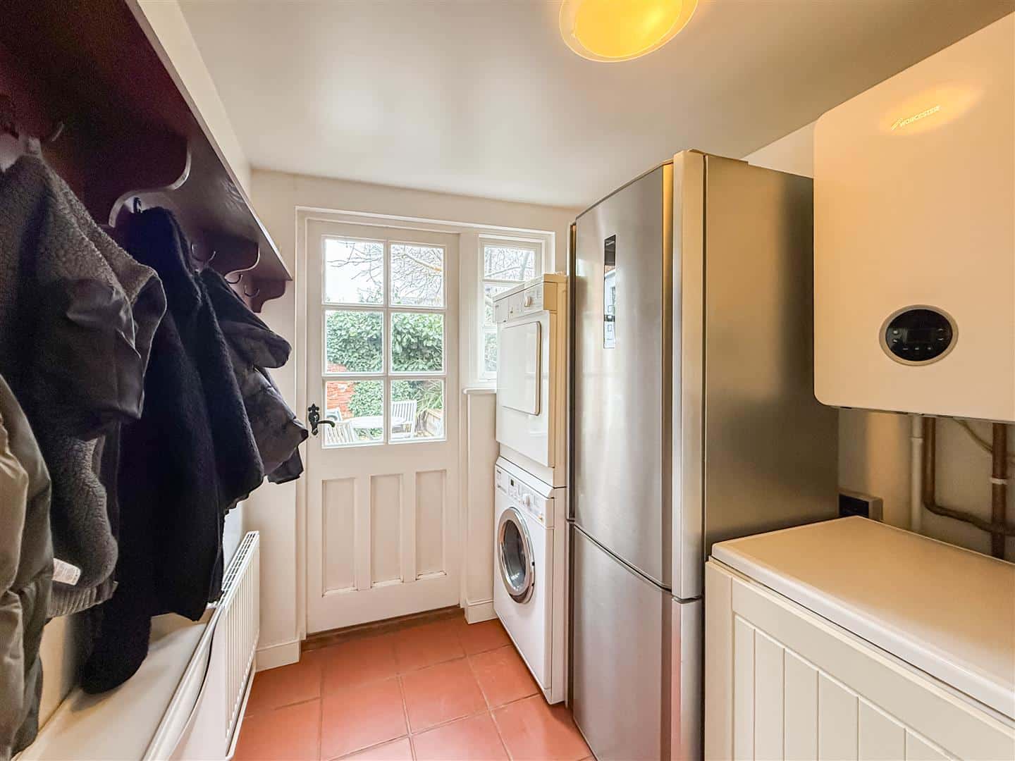 Tiled flooring, wall mounted boiler for hot water and heating (not tested) plumbing for washing machine and tumble dryer. Second staircase to the office/potential fourth bedroom, door and window to the rear.