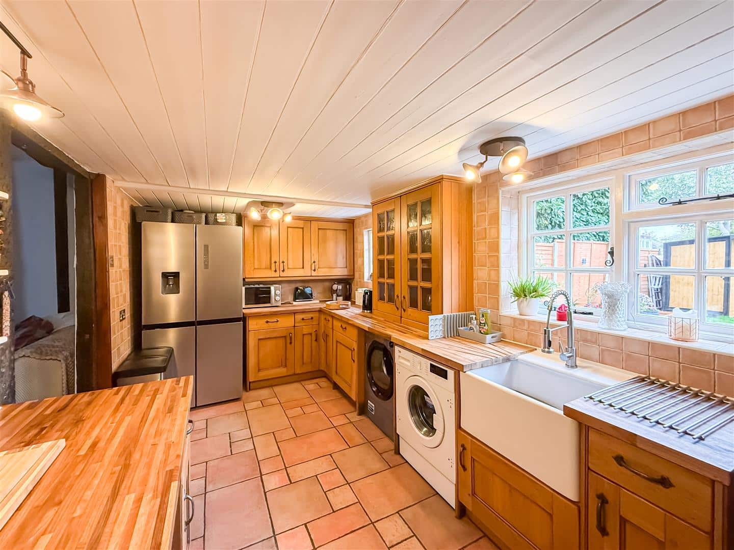 Butler sink, integrated dish washer, plumbing for washing machine, space for a fridge/freezer and tumble dryer and a range cooker with gas hob and electric ovens to remain with above extractor. PLEASE NOTE the gas supply for the heating/hot water boiler and oven is via Calor Gas bottles and usage information is available with the against. Wood panelled ceiling, single and double glazed windows to the rear.