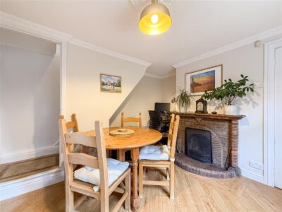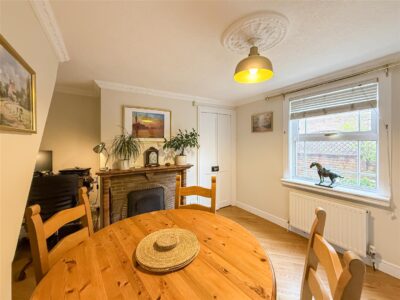 The dining room again has an original open fireplace with half moon hearth and recess to one side. Plenty of space for a table and chairs great to enjoy for family gatherings and entertaining. Oak effect laminate flooring, double glazed window to the front with fitted blind and door to the second porch, stairs to the first floor and radiator.