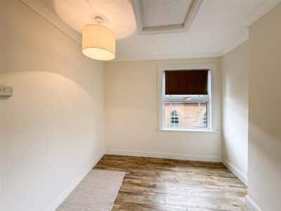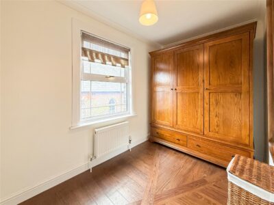 Wood effect laminate flooring, single built in cupboard/wardrobe, radiator and double glazed windows to the front and side.