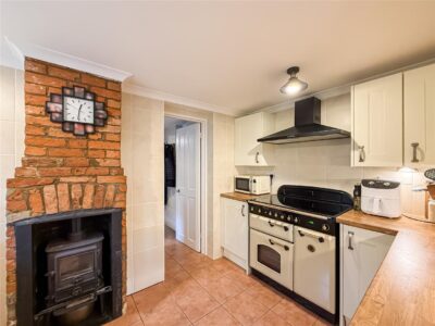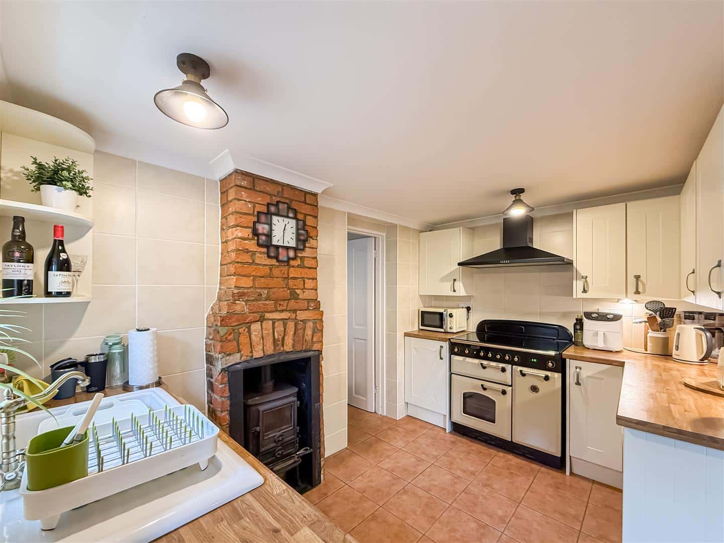 The kitchen has a range of cream eye level units with back tiling, matching base units and drawers with roll top wood effect work surfaces over. Inset white enamel sink and space for a range style electric oven with above extractor and an open fireplace with inset cast iron wood burner and tiled flooring, stable door to the front.