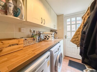 The tiled flooring continues from the kitchen and this room has matching eye level units to the kitchen. Fitted work surface with plumbing for washing machine and dish washer and door to the front.