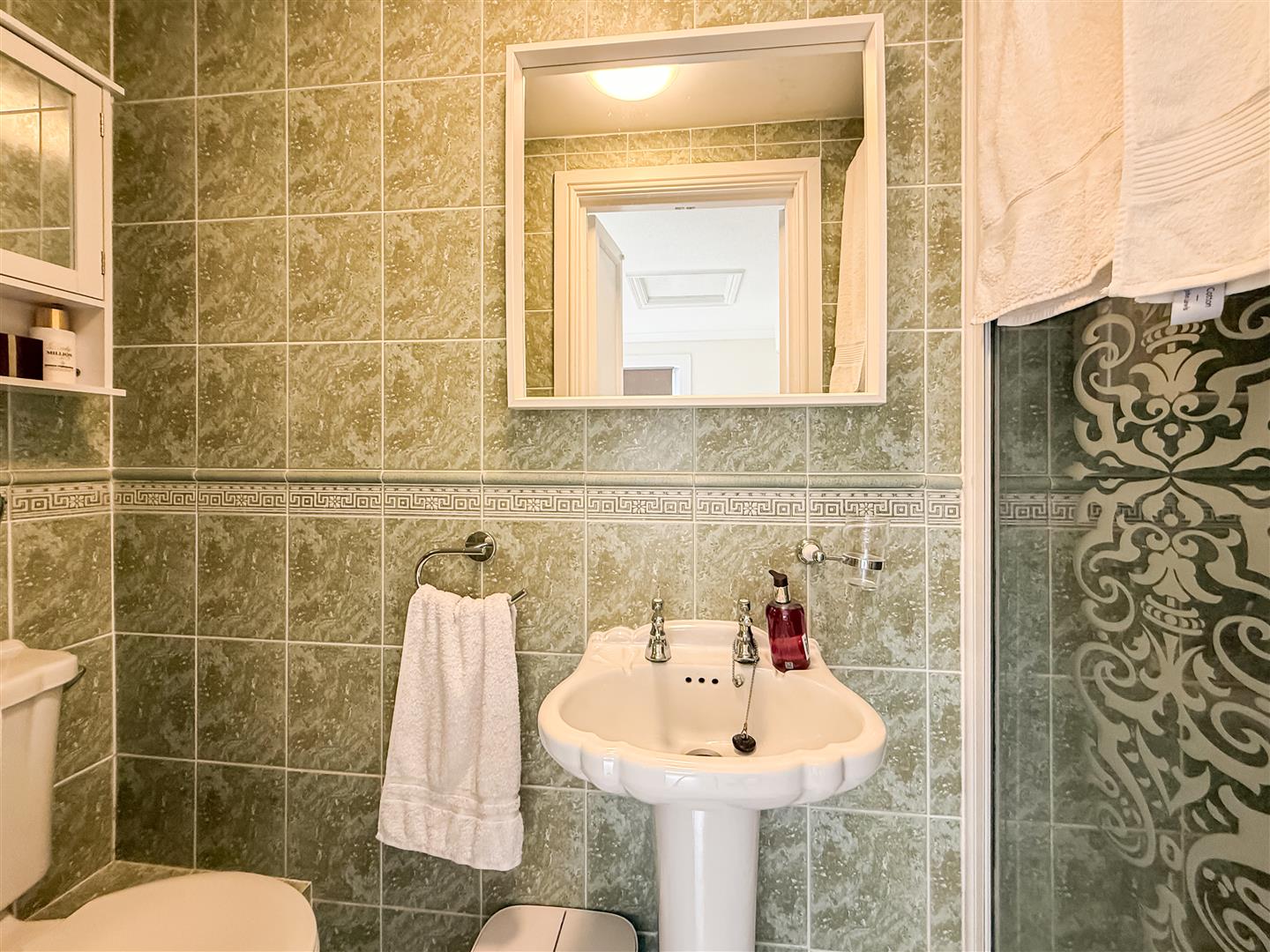 En-suite walk in shower cubicle with recently replaced shower, pedestal hand wash basin, close coupled w/c and tiled walls.