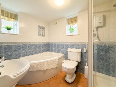 A generous size room with a corner bath, walk in shower cubicle, pedestal hand wash basin and a close coupled w/c. Tiled walls and flooring, white towel rail, expel air and a double glazed window to the front and side.