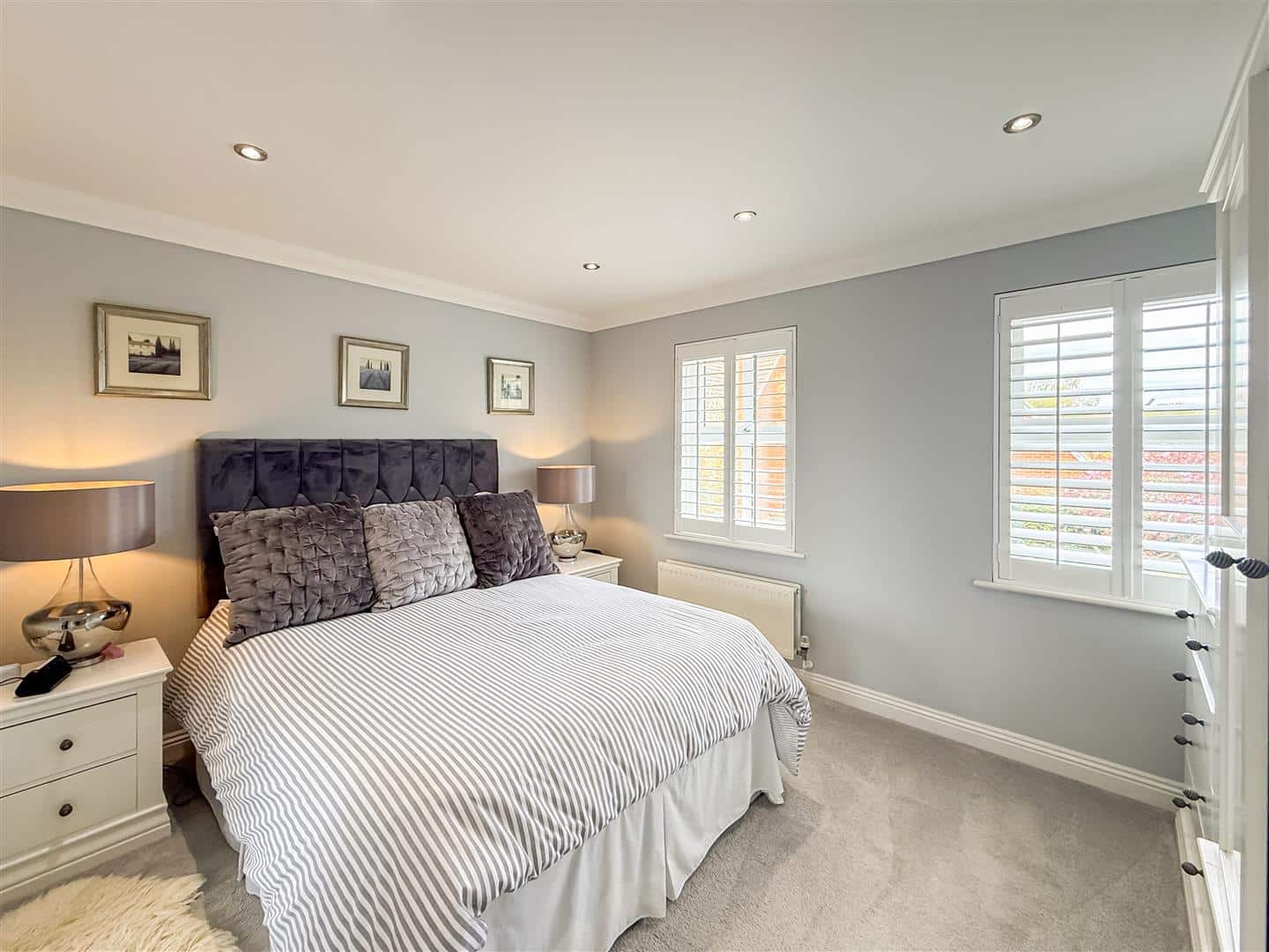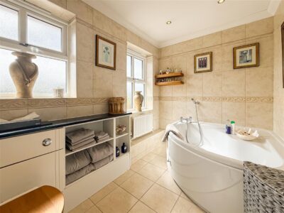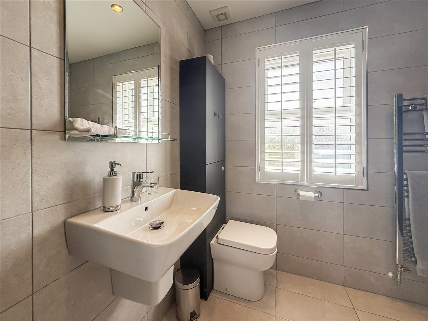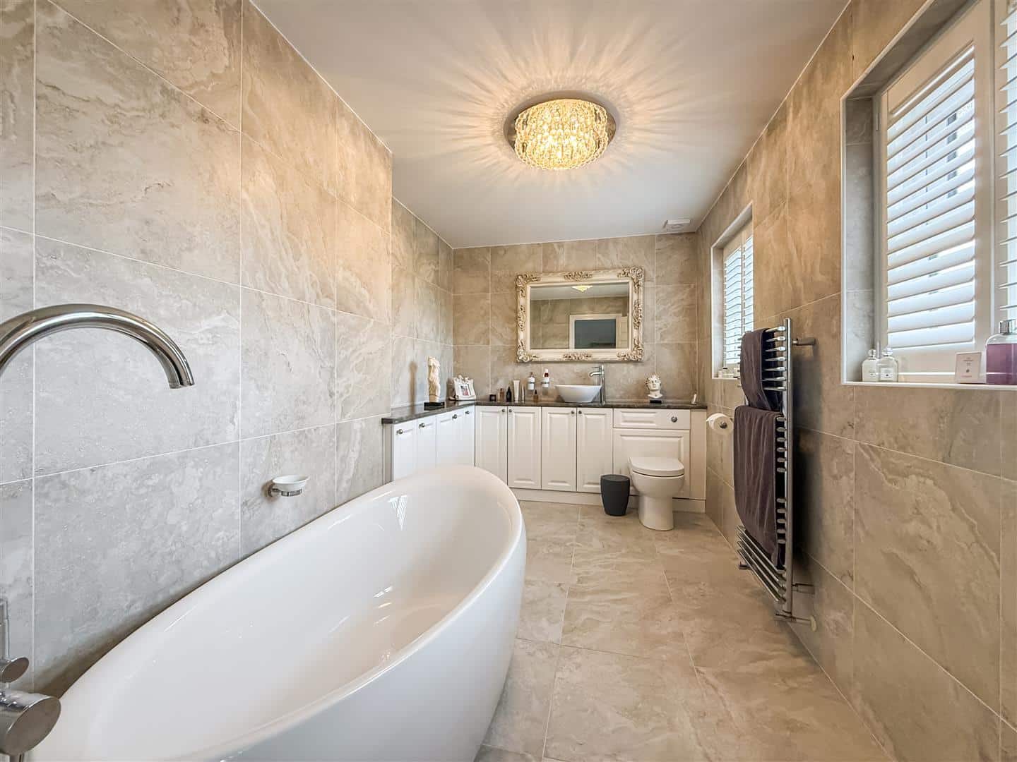 A gorgeous size room as you would expect being the principal room. Plenty of space here for free standing or fitted wardrobes, television point, two radiators and double glazed windows to the side with fitted white shutter/blinds. Chrome heated towel rail, tiled walls and flooring, expel air and dual double glazed windows to the rear with fitted white shutter/blinds.