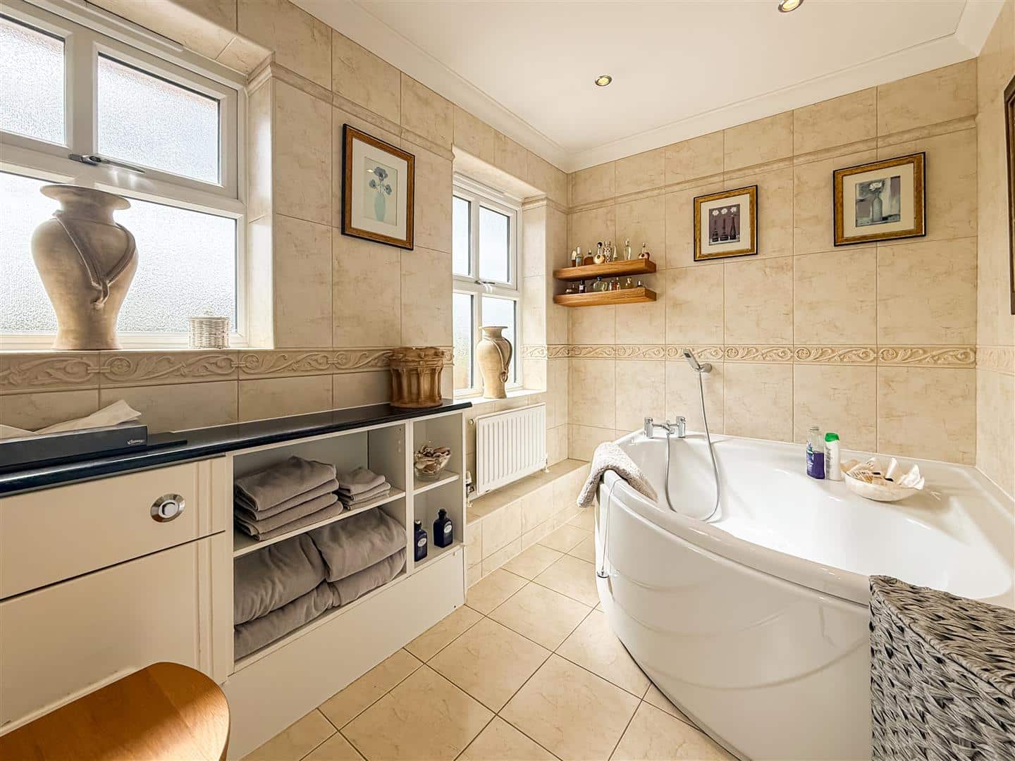 Tiled walls and flooring, over size corner bath with taps/shower attachment, w/c with concealed cistern vanity surround cupboards and shelving. Down lighting, expel air, radiator and dual double glazed windows to the front.