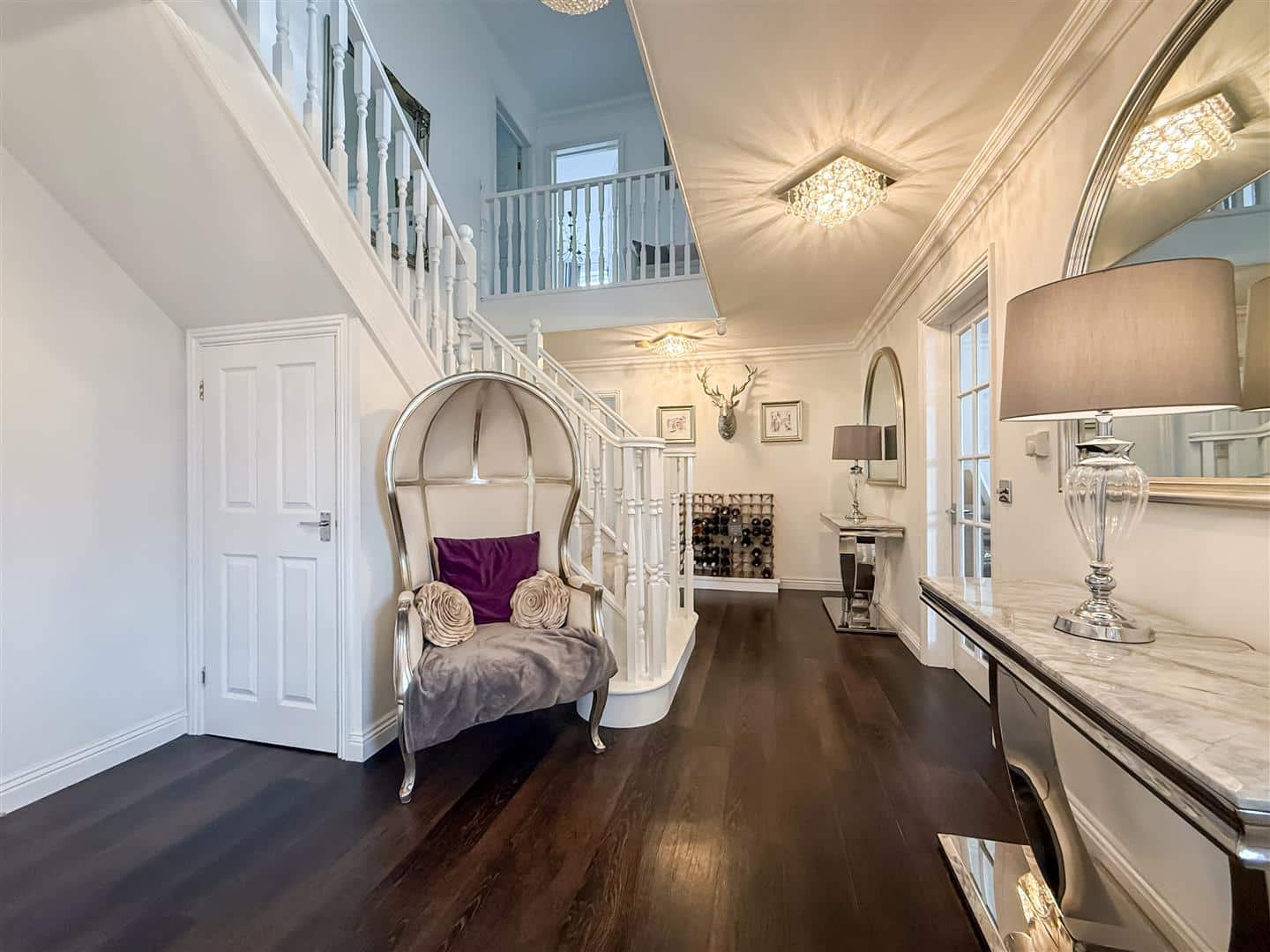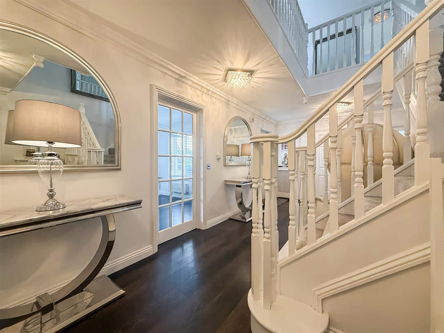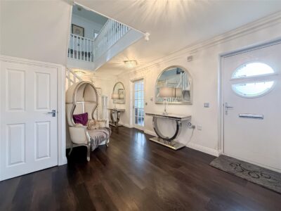Entrance door to a large reception hallway which has quality laid Karndean wood effect flooring, running throughout the ground floor. Cloaks cupboard and understairs cupboard, stairs to the first floor landing, two radiators both with decorative covers.