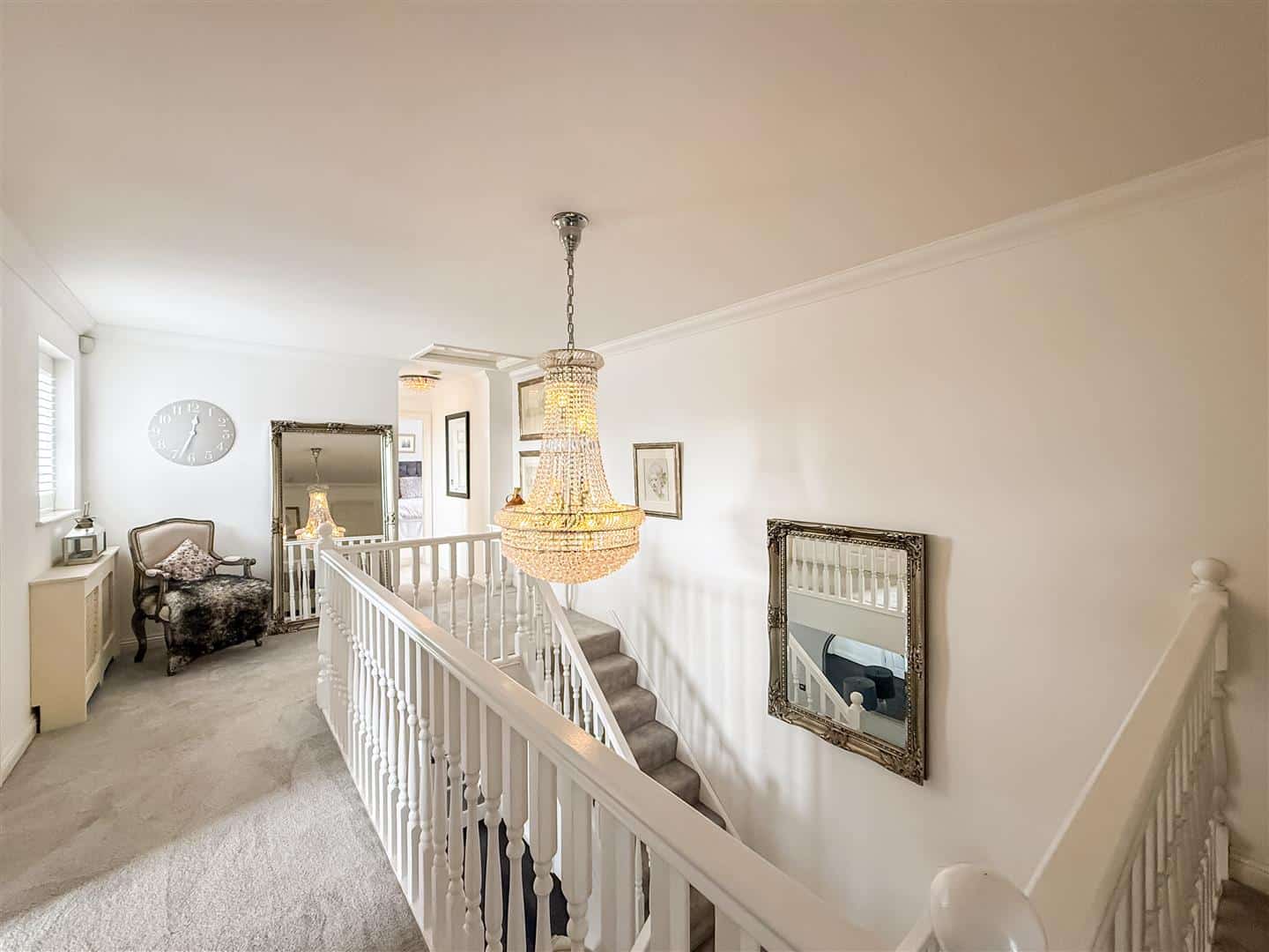 An impressive size gallery landing with lots of space to just sit and relax or read. PLEASE NOTE a few of the neighbouring properties have twisted the stairs to go into the loft space, which is substantial, subject to any consents required and does make for an additional games room/cinema room or similar. Loft access, linen cupboard with shelving and pressurised water tank, radiator with decorative cover and windows to the front with fitted white/shutter blinds.