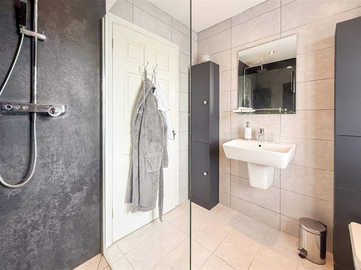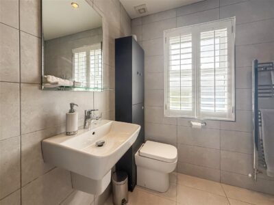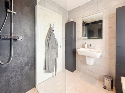 En-suite Walk in wet room shower with both hand held and rain showers, hand wash basin, w/c with concealed cistern and fitted vanity cupboards. Tiled walls , down lighting, chrome heated towel rail and a double glazed window with fitted white shutter/blind to the front.