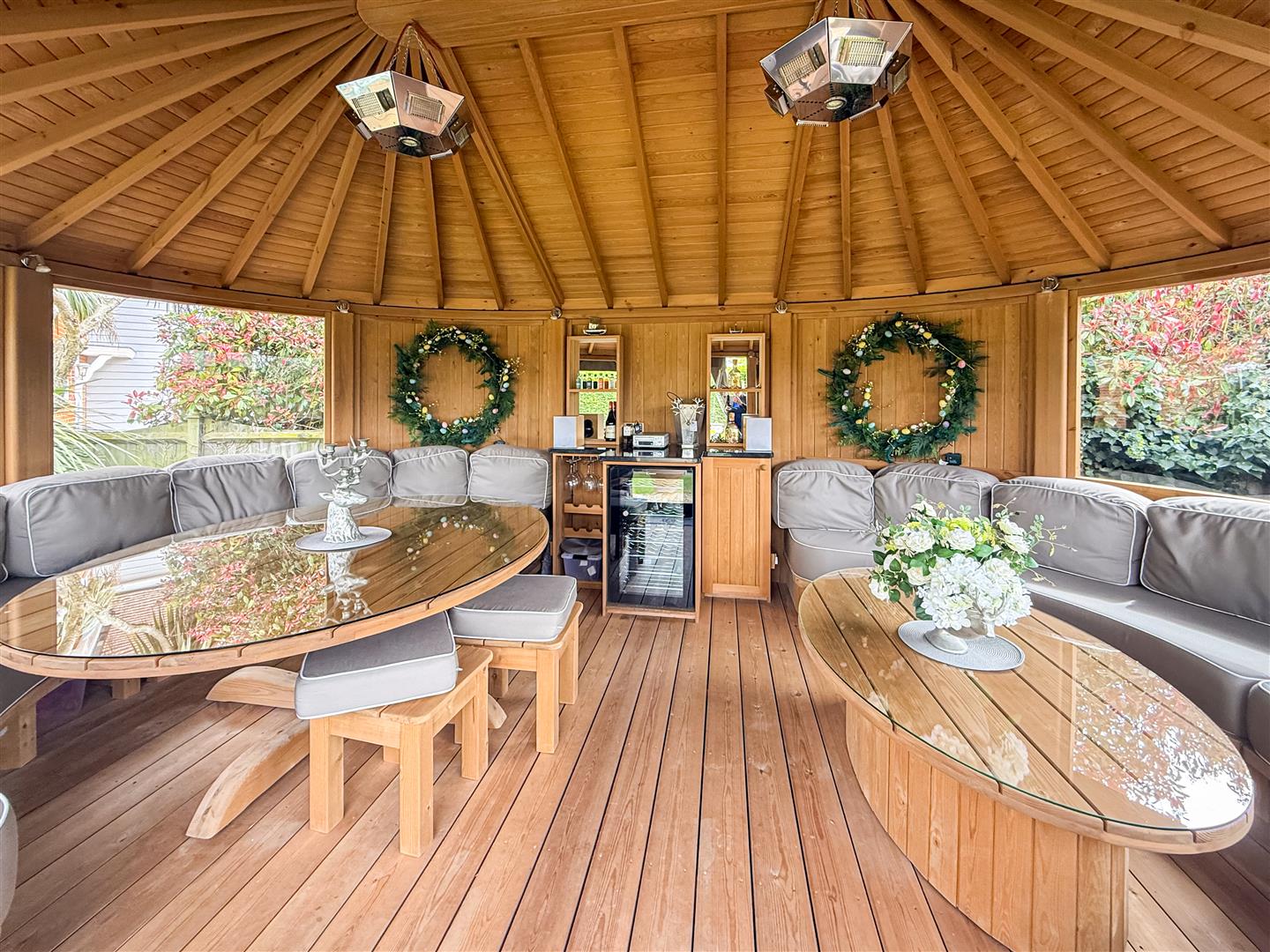 The pavilion is a luxury all year around entertaining building, ideal for large family gatherings and special occasion, it offers seating for at least 25 people, electric, heating a bar, chiller and dining and coffee tables.