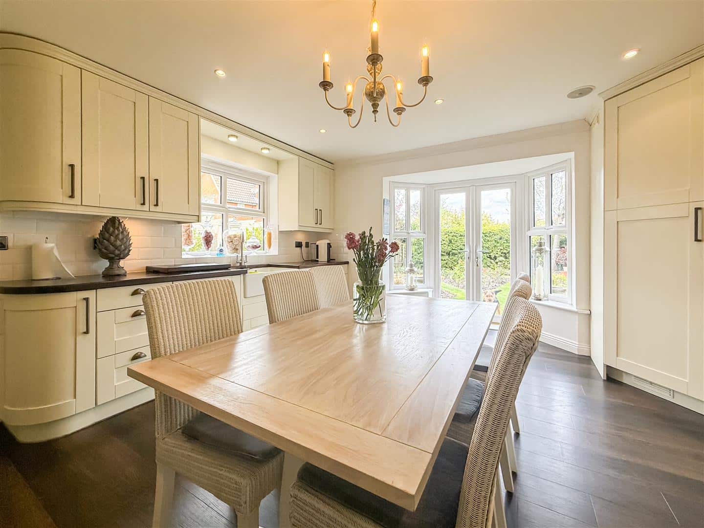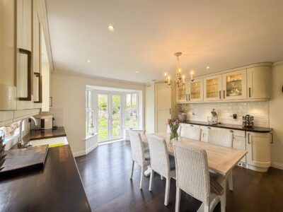Plenty of space here for a good size family breakfast table and chairs, double glazed windows to both side aspects, double glazed French doors and side screen windows to the rear and garden.