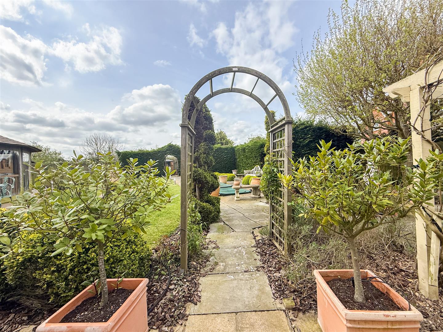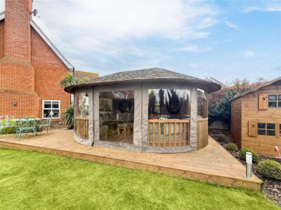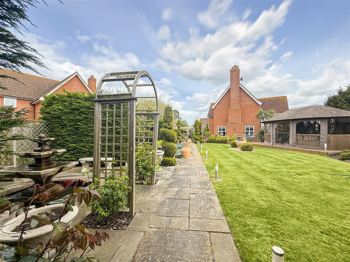 Commencing with a patio area that wraps around the side of the houses and opens up into various designed sections of the garden, made up of planted borders with well stocked shrubs, plants, trees and climbers. There is a inset fish pond with pumped water and water fountain and a large pergola with light to sit and relax, mature hedging and established planting leading a further seating area and an to the main lawn and raised deck with luxury pavilion.