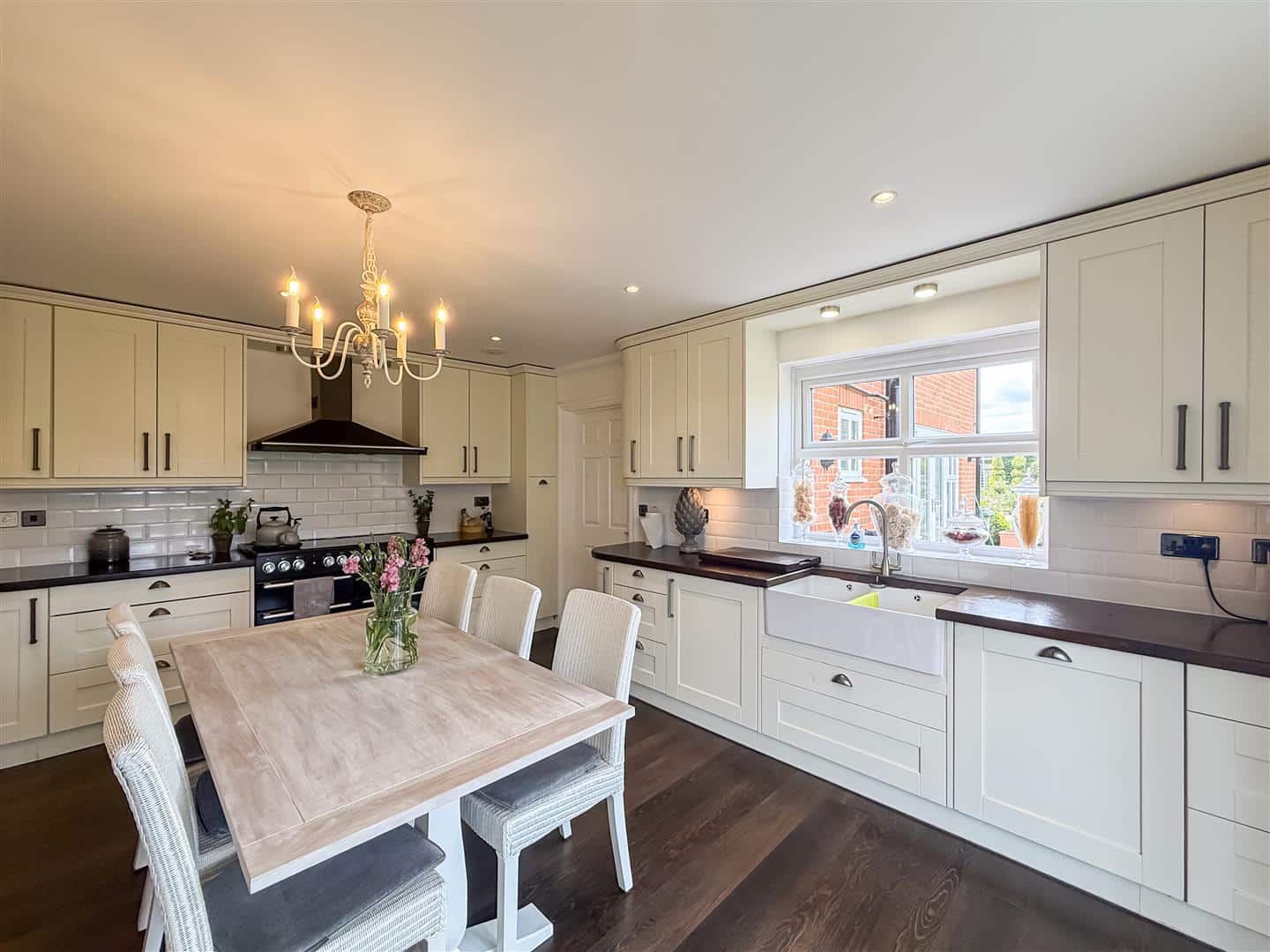 The kitchen has a range of cream eye level units with under lights, including two double lit display cabinets with back tiling, matching base units and drawers with solid wooden work surfaces over. Integrated freezer and an American style walk in larder fridge, twin butler sinks, electric range cooker and above extractor, down lighting and inset audio ceiling speakers