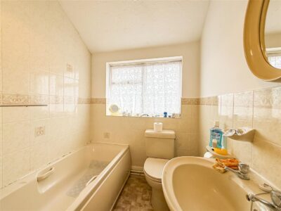 Panelled bath taps/shower attachment, close coupled w/pedestal hand wash basin, part tiled walls. Airing cupboard with lagged water tank and a window to the rear.