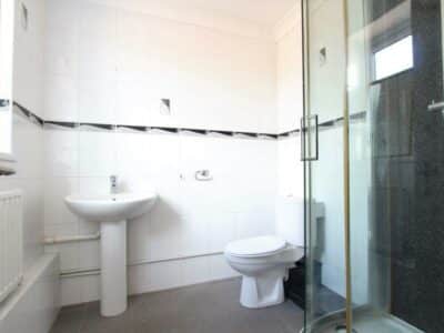 Upvc double glazed window to rear, three-piece suite comprising of low-level W/C, wash hand basin, shower cubicle, tiled walls surround, heated towel radiator, tiled floor.