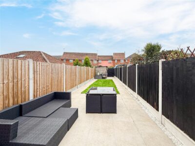 An really good size garden great to sit out, entertain and enjoy with a large quality fitted porcelain patio with inset electric lights. Neatly laid lawn, garden shed and outside water tap.