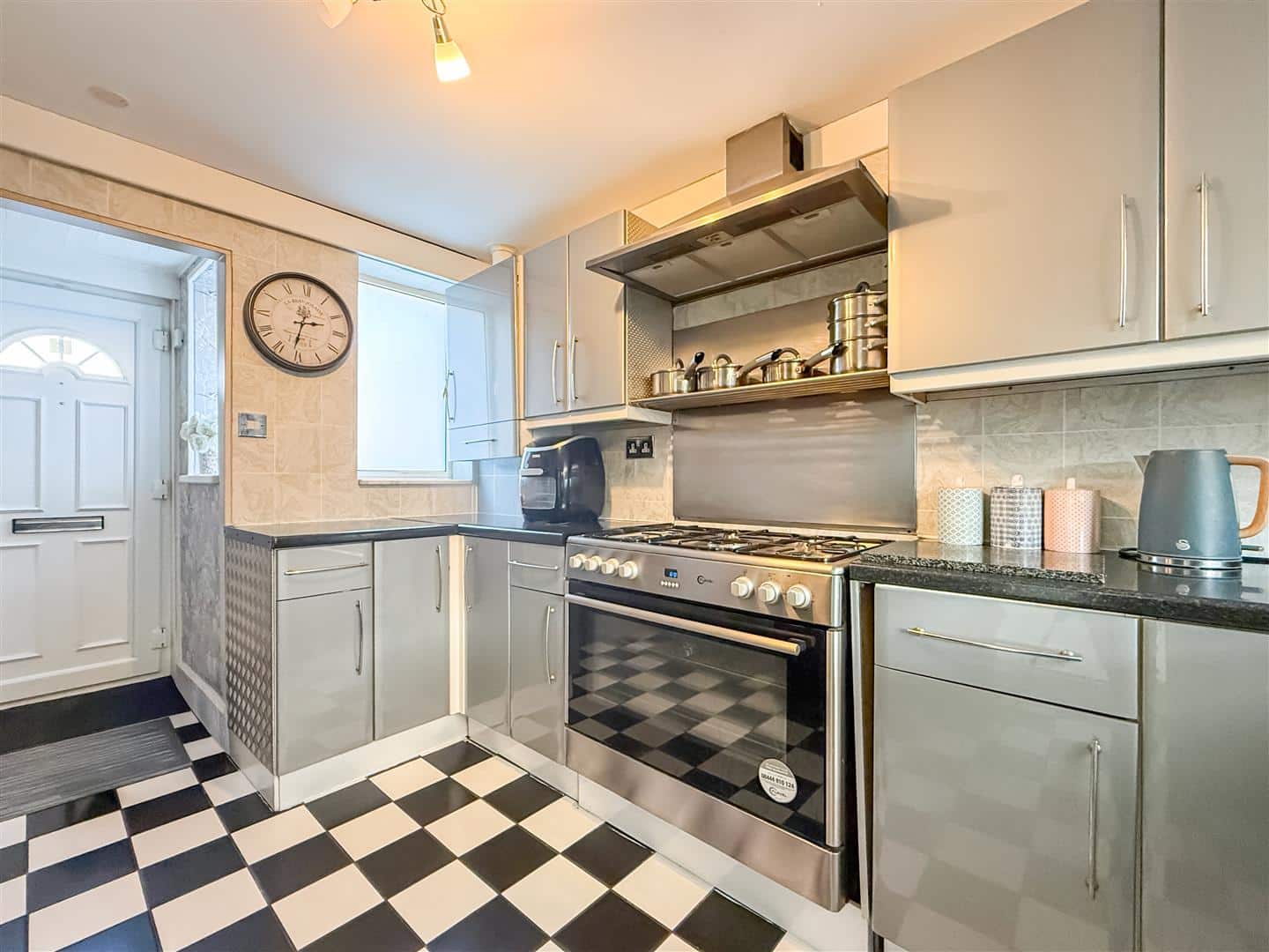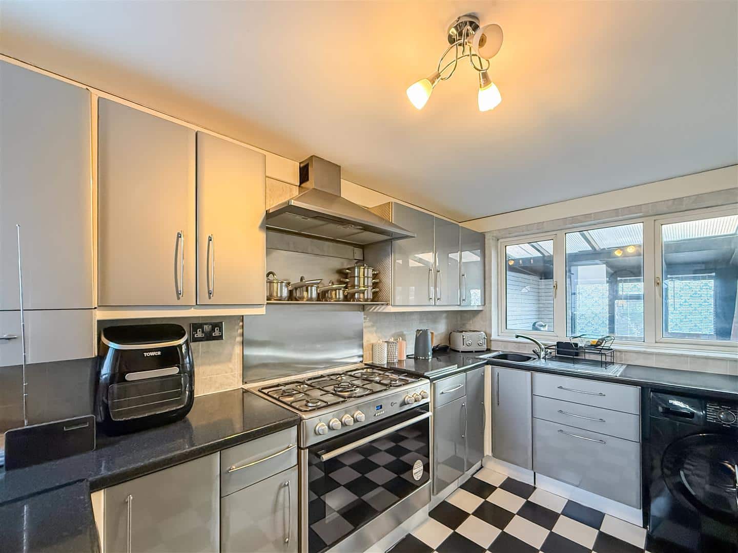 The kitchen has a range of high gloss eye level units with back tiling, matching base units and drawers with marble effect work surfaces over. Range style cooker with gas rings and electric oven and above extractor to remain, inset sink stainless steel sink, plumbing for washing machine, space for fridge/freezer. Tiled flooring, radiator and a double glazed window to the rear.